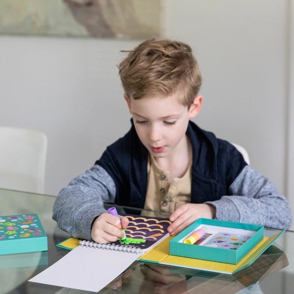 - Zawartość zestawu: 6 neonowych kredek w nakładkach, 36-stronicowa książeczka z zadaniami, 5 arkuszy naklejek, pudełko do przechowywania