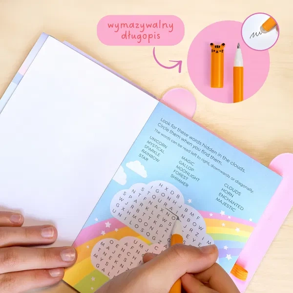 Motyw jednorożców zachwyca małych odkrywców i wspiera rozwój kreatywności oraz spostrzegawczości. Dzięki kompaktowemu rozmiarowi i zmazywalnemu pisakowi dzieci mogą powtarzać zadania dowolną ilość razy – w domu, w podróży czy w poczekalni.