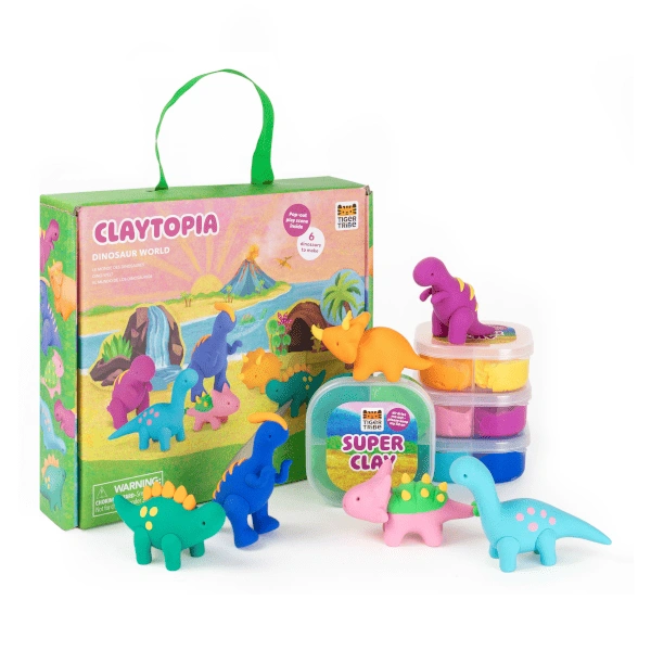Przenieś się do prehistorycznego świata i stwórz własne, kolorowe dinozaury! Zestaw Plastyczna Przygoda: Dinozaury od Tiger Tribe to wyjątkowa propozycja dla małych artystów, którzy kochają modelowanie, kreatywność i odkrywanie. W komplecie znajduje się wszystko, czego potrzeba, by ulepić figurki z lekkiej, schnącej na powietrzu masy plastycznej i ożywić je na dołączonej planszy do zabawy.