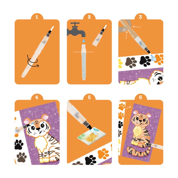 - Pędzelek wodny – bezpieczny pędzelek, który wystarczy zanurzyć w wodzie, aby rozpocząć malowanie, bez konieczności używania farb.