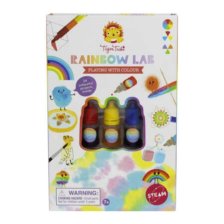 - Tęczowe Laboratorium od Tiger Tribe to zestaw 24 eksperymentów, który wprowadza dzieci w świat kolorów, ucząc zasad STEAM poprzez kreatywną, edukacyjną zabawę. Idealny do samodzielnych i grupowych aktywności.