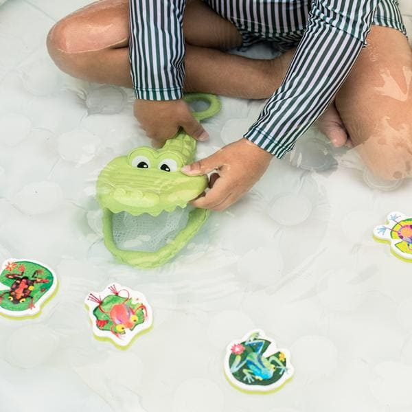 - Zestaw „Złap Żabkę” to doskonały sposób na przekształcenie codziennej kąpieli w radosną i angażującą zabawę. W zestawie znajduje się siatka w kształcie krokodyla oraz siedem kolorowych, unoszących się na wodzie żabek wykonanych z miękkiej pianki.