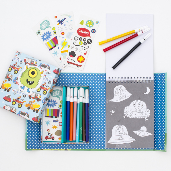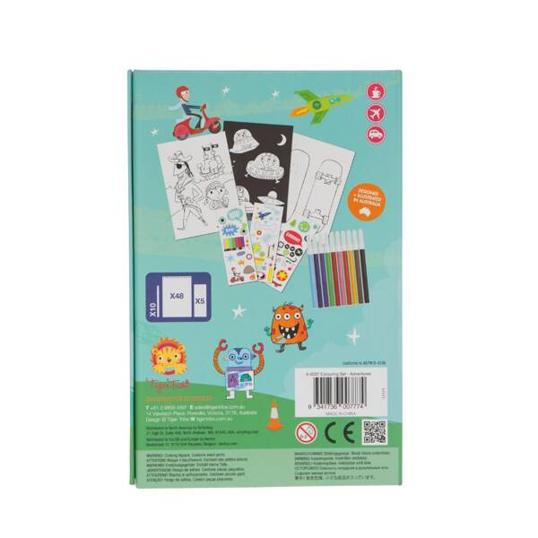 - Zestaw Kolorowanek "Przygody" od Tiger Tribe to kreatywna zabawa z kolorowankami, markerami i naklejkami w przenośnym pudełku. Idealny dla dzieci 4-7 lat. Wymiary: 13,8x4x21 cm.