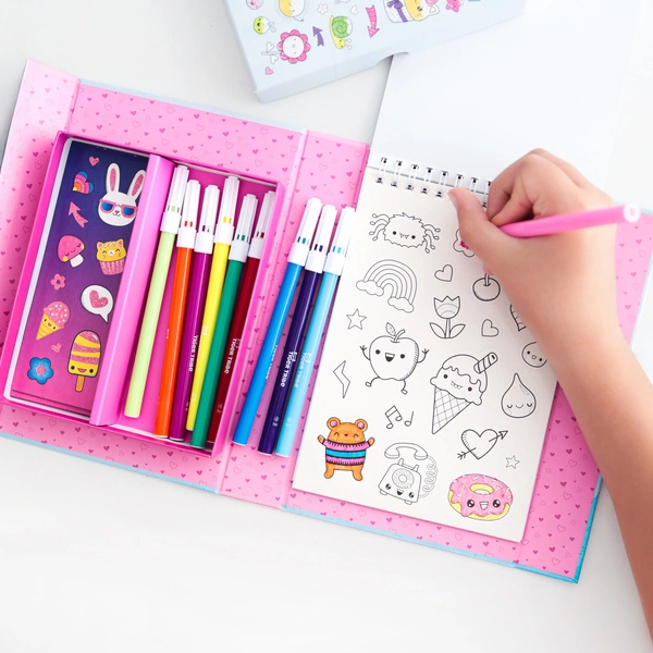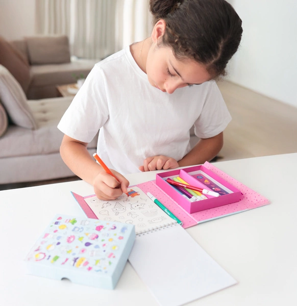 Świetny zestaw dla małych artystów, który pozwala na personalizację notatników, pamiętników i innych powierzchni za pomocą własnoręcznie kolorowanych naklejek. Wszystkie elementy mieszczą się w kompaktowym pudełku z magnetycznym zamknięciem, dzięki czemu zestaw jest idealny do zabawy w podróży. To doskonała alternatywa dla ekranów, wspierająca kreatywność, koncentrację i relaks.