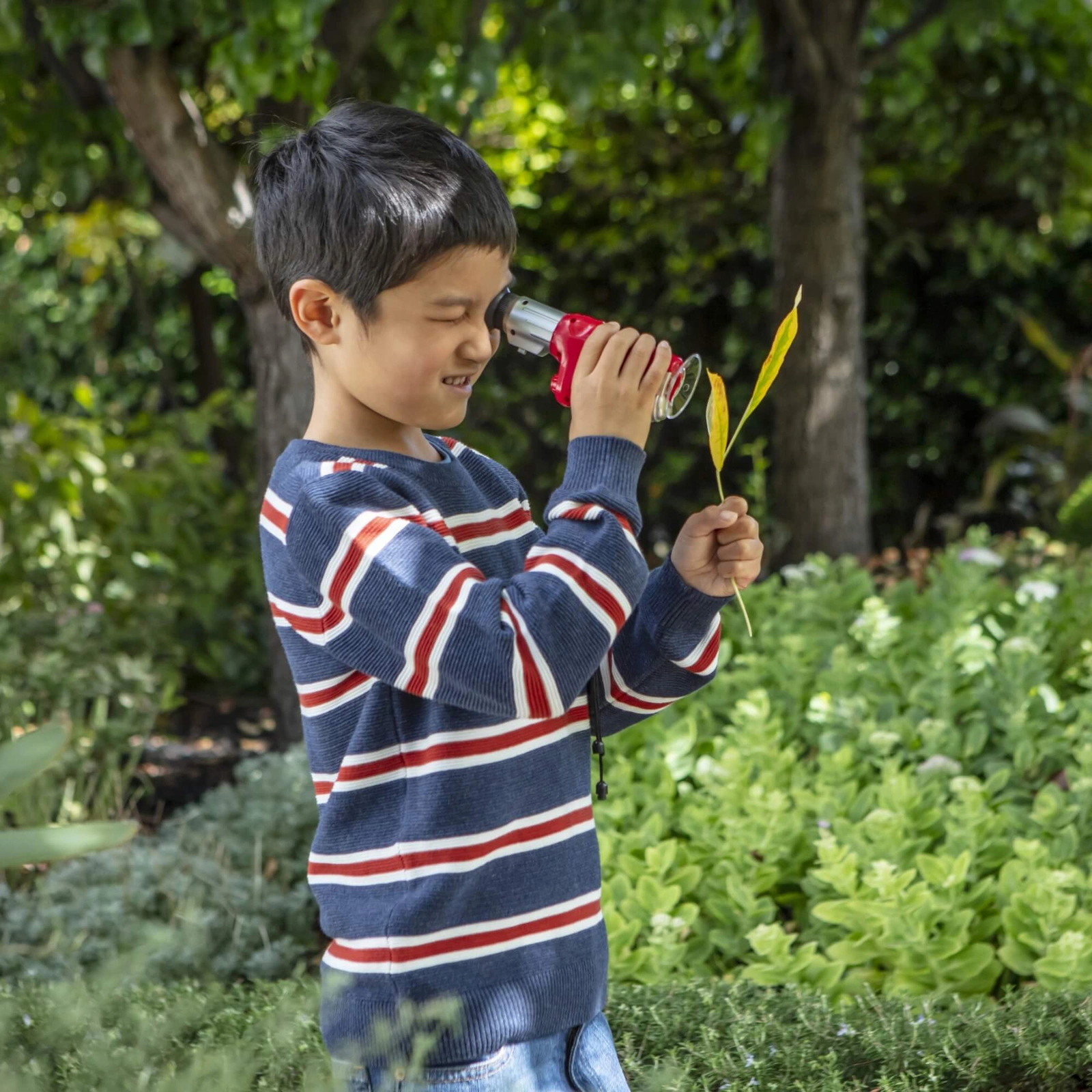 Zaprojektowany specjalnie z myślą o dzieciach, mikroskop oferuje dwa poziomy powiększenia (x20 i x60) oraz wbudowane światło LED, które zapewnia doskonałą widoczność obserwowanych próbek. W zestawie znajduje się także ilustrowana książeczka z inspirującymi zadaniami, eksperymentami i pomysłami na terenowe wyprawy badawcze.