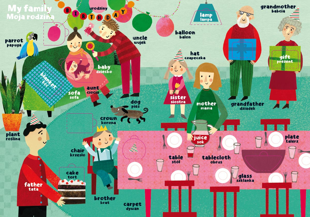 To książka edukacyjna, dzięki której najmłodsi poznają świat i uczą się angielskich słówek. Pojawia się tu słownictwo związane z domem i rodziną: nazwy pomieszczeń i sprzętów, zabawek i ubrań, członków rodziny, części ciała i wielu drobiazgów, w sumie ponad 200 słówek.