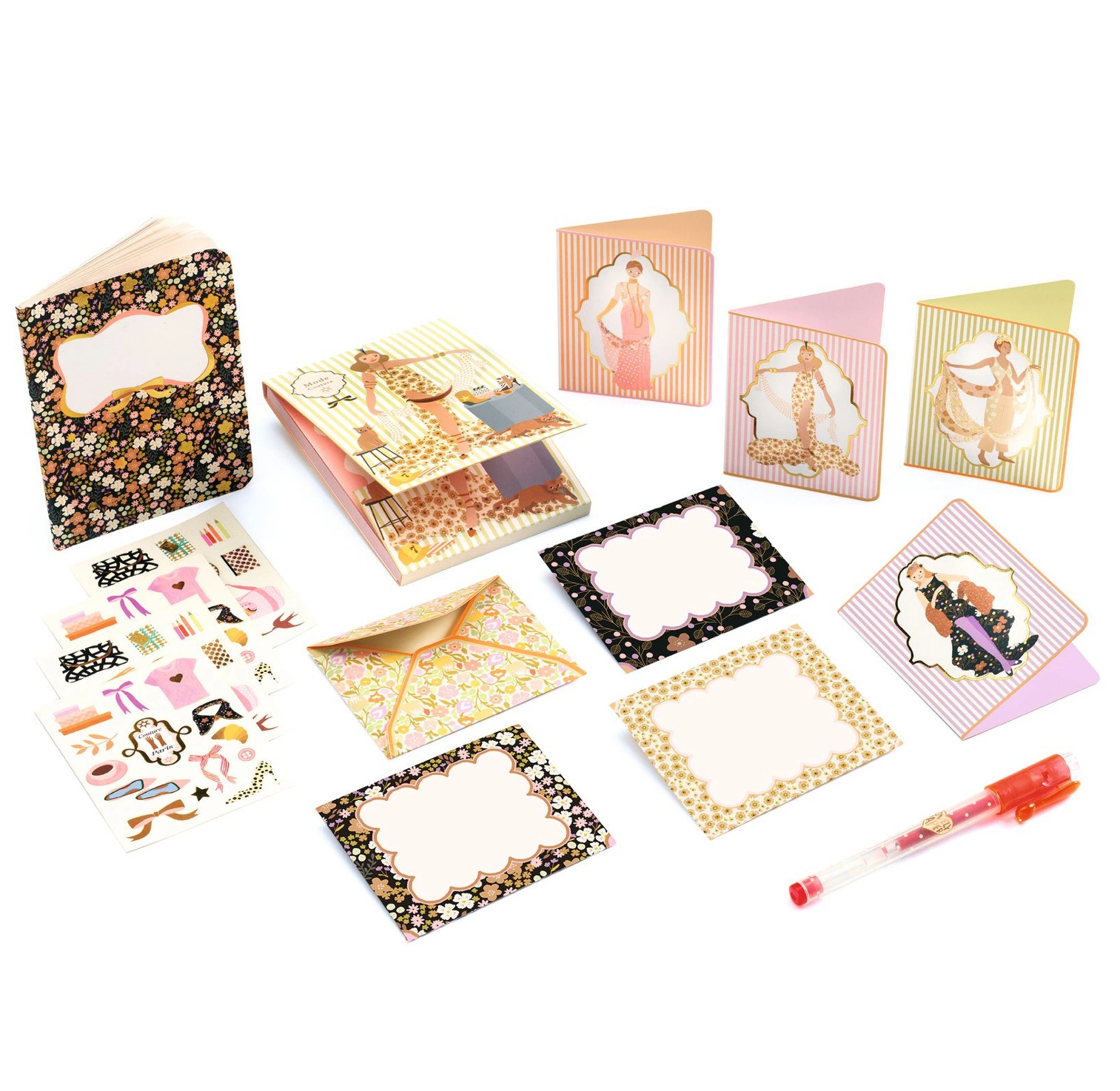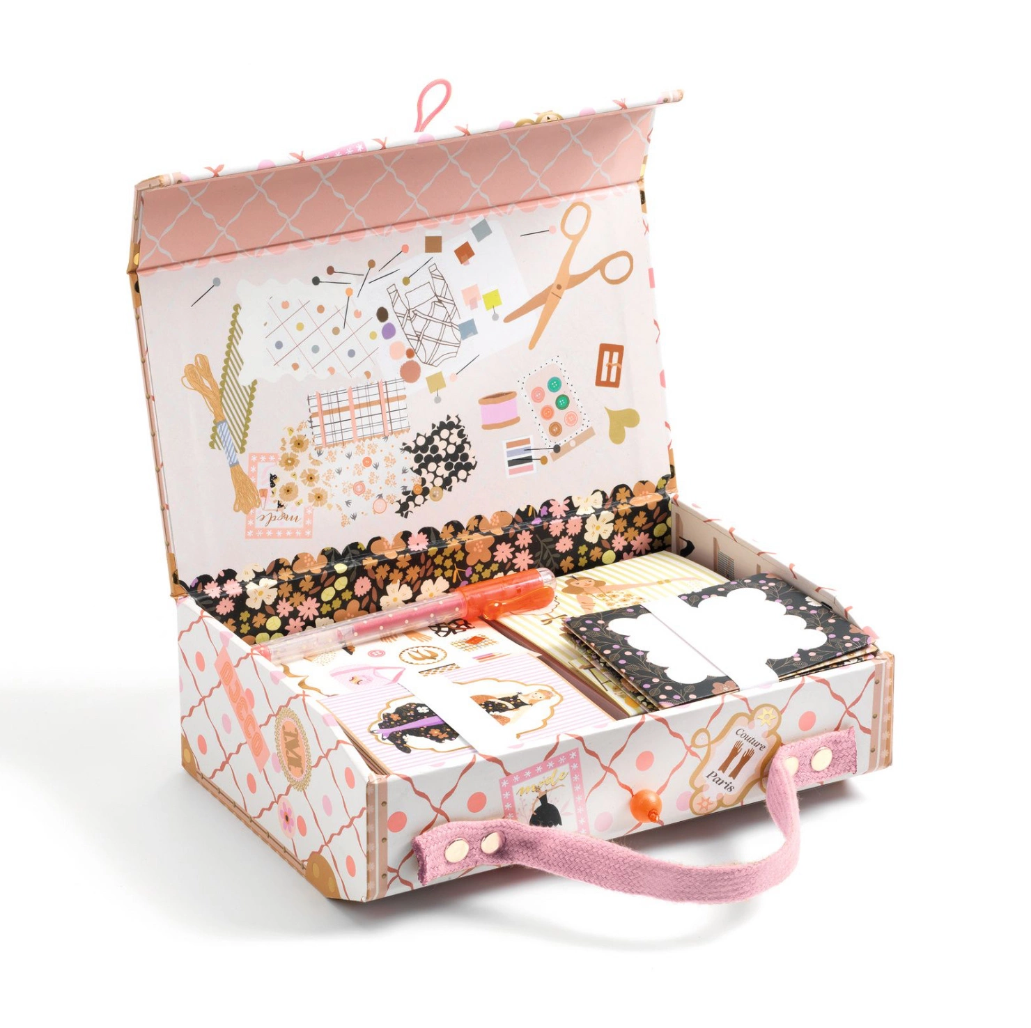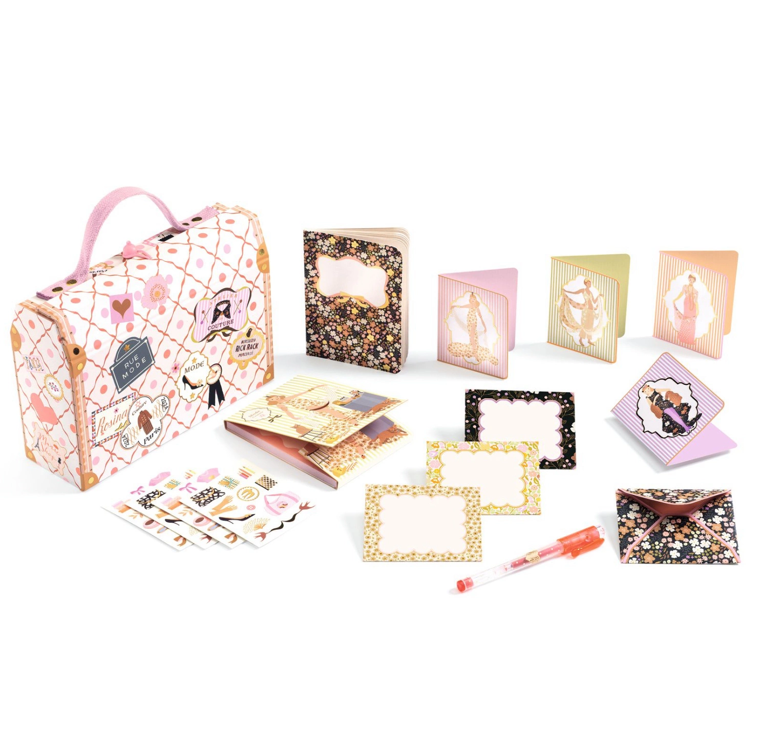 W środku znajduje się komplet eleganckich akcesoriów do pisania i tworzenia – notes, notesik, długopis żelowy, koperty, zaproszenia oraz naklejki. To doskonały zestaw do pisania listów, rysowania, planowania lub zabawy w małą artystkę. Całość zamknięta w poręcznej walizeczce idealnie sprawdzi się w podróży, na biurku lub jako prezent dla miłośników pięknej papeterii.