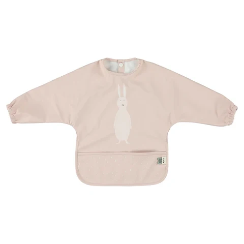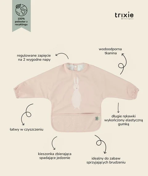 - Śliniak z długimi rękawami Trixie Baby skutecznie chroni ubranka podczas posiłków. Ma praktyczną kieszonkę, jest wodoodporny i wykonany z recyklingowanego poliestru – łatwy w czyszczeniu i wygodny w użyciu!
