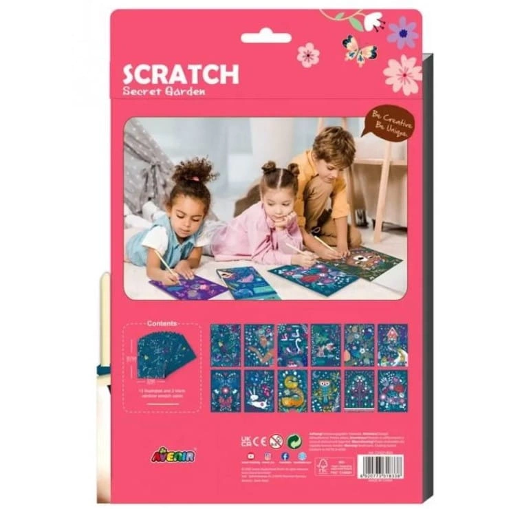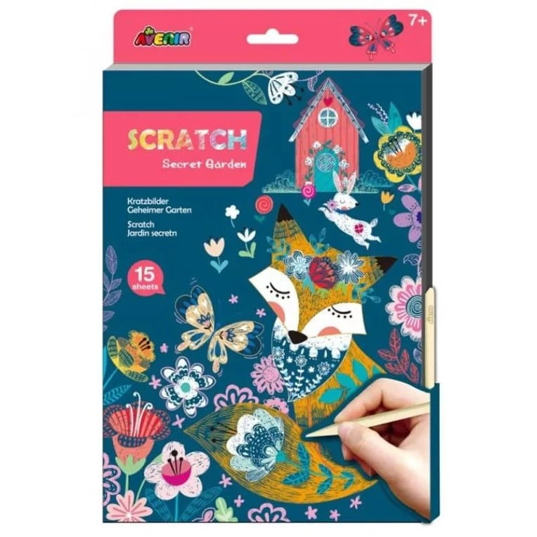 Avenir Scratch to zupełnie nowe podejście do prac ręcznych. Wyjątkowy arkusz, na którym tworzy się poprzez zdrapywanie warstwy wierzchniej, by odsłonić wielobarwną warstwę spodnią. Wydrapywanka A4 zawiera 13 gotowych obrazów, 2 puste karty, które zapewniają całkowitą swobodę twórczą oraz patyczek do zdrapywania.To ciekawa propozycja dla kreatywnych dzieci i ćwiczenie zdolności motorycznych.