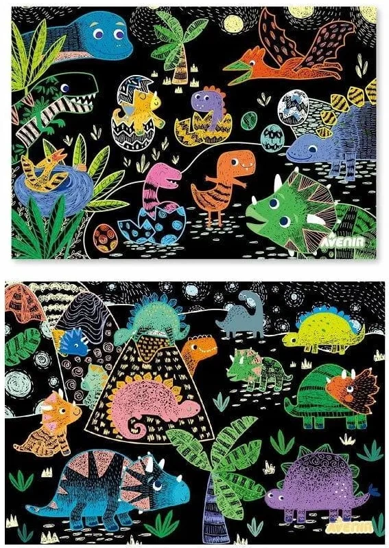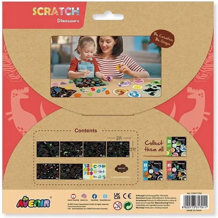 - Avenir Scratch Art Dinozaury to zestaw dla dzieci powyżej 5 lat, zawierający 7 kart do zdrapywania. Dzieci odkrywają dinozaury, uczą się liczyć i poznają kolory. Zawiera drewniany patyczek.