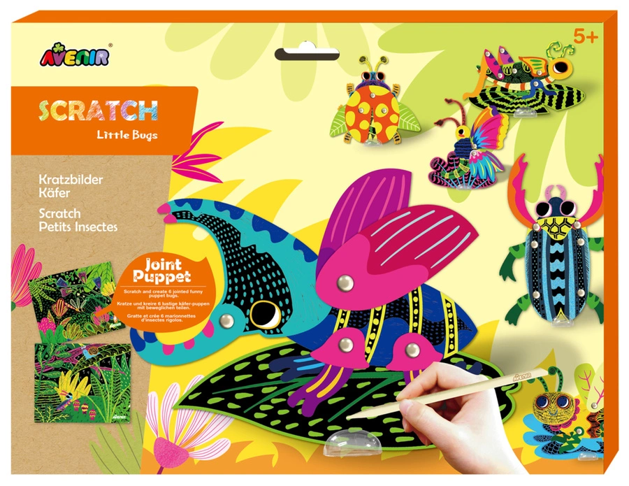 Avenir Scratch to nowoczesne i niezwykle angażujące podejście do prac ręcznych, które zachwyca dzieci niecodzienną techniką tworzenia. Zamiast tradycyjnego rysowania czy malowania, maluchy zdrapują wierzchnią warstwę specjalnego arkusza, odsłaniając pod spodem kolorową, wielobarwną powierzchnię. Zestaw „Małe owady” pozwala na wykonanie sześciu ruchomych laleczek przedstawiających urocze owady, które po złożeniu stają się zabawką gotową do dalszej kreatywnej zabawy. Dziecko może samodzielnie ozdobić zarówno korpusy owadów, jak i tła, tworząc unikalne wzory, które ogranicza jedynie jego wyobraźnia.