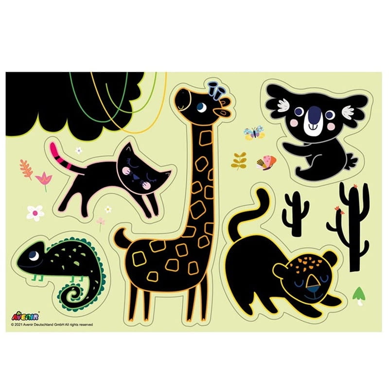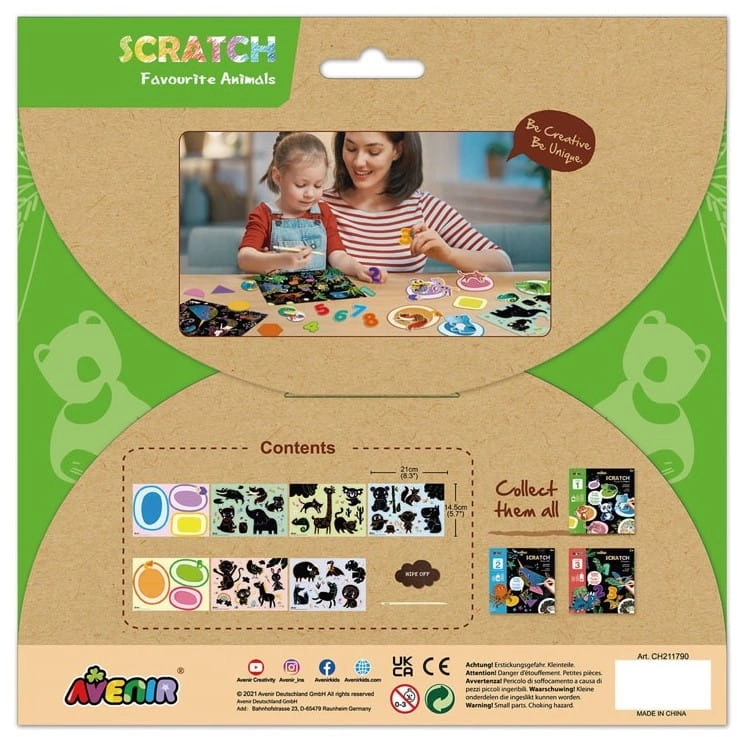 - Avenir Scratch Art Ulubione zwierzęta to zestaw dla dzieci, który zawiera 7 kart do zdrapywania. Dzieci odkrywają zwierzęta, łącząc je z podłożami o tym samym kolorze. Zawiera drewniany patyczek.
