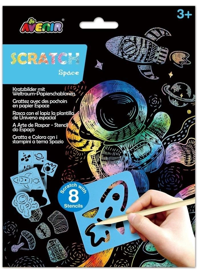 - Avenir Scratch to kreatywna zabawa, gdzie dzieci zdrapują kosmiczne arkusze, odkrywając kolorowe tła. Zestaw zawiera 2 arkusze, 8 szablonów, patyczek do zdrapywania i szmatkę.