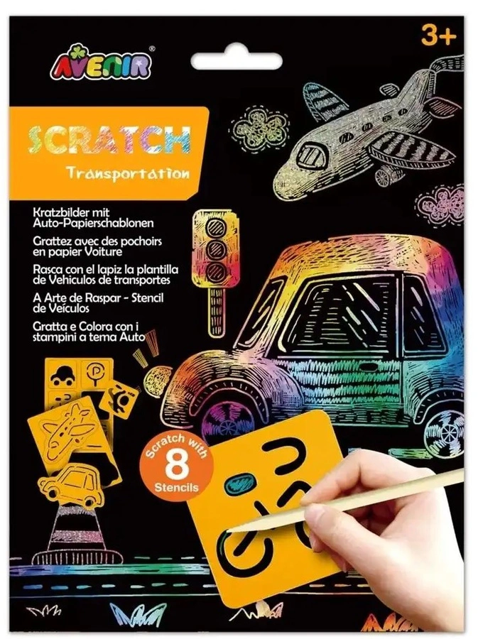 - Avenir Scratch to kreatywna zabawa, w której dzieci zdrapują warstwę wierzchnią, odsłaniając kolorowe wzory transportu. Zestaw zawiera 2 arkusze, 8 szablonów, patyczek i szmatkę.