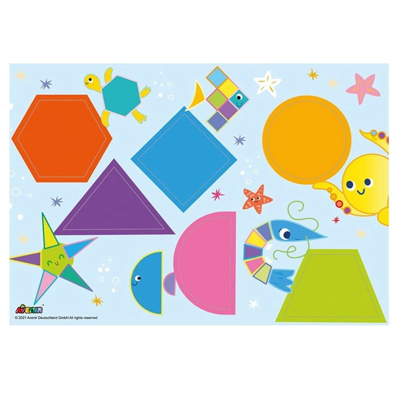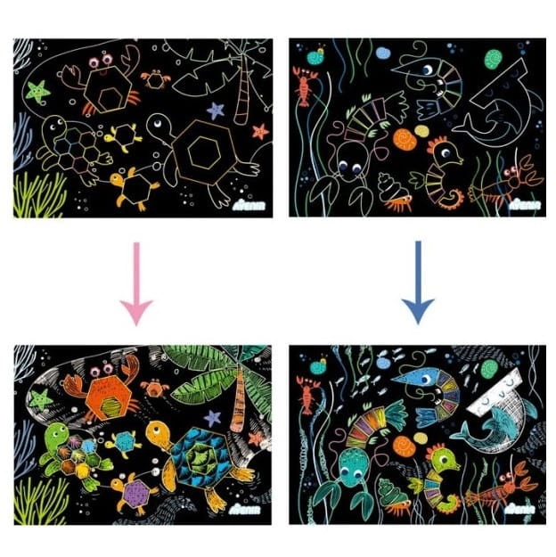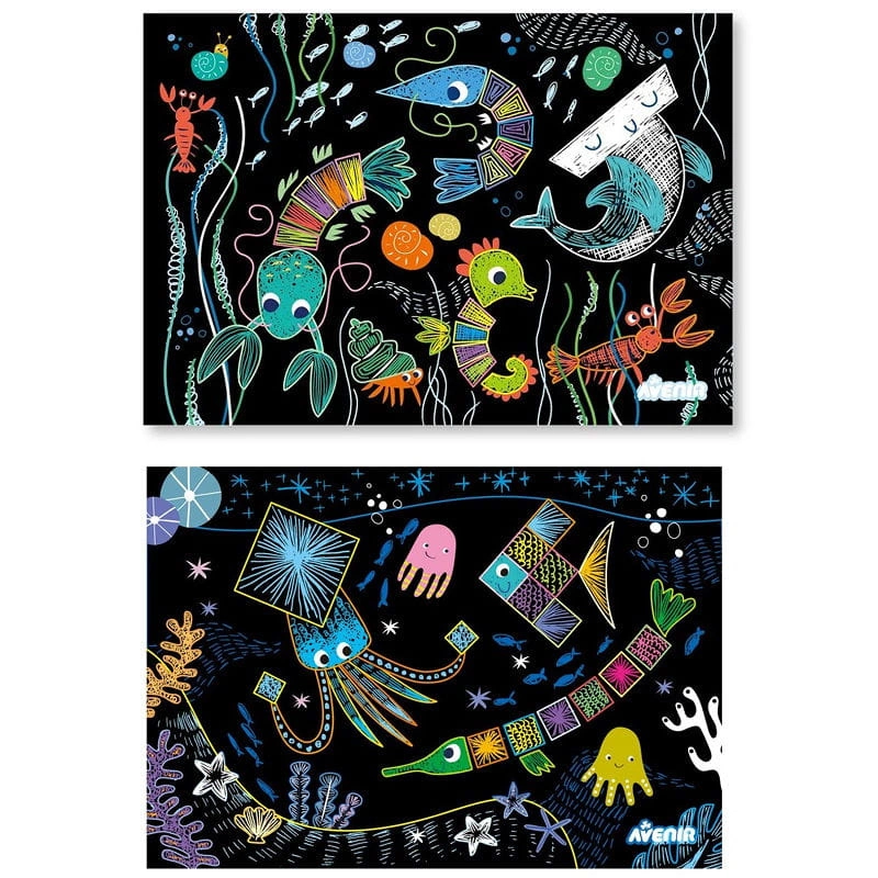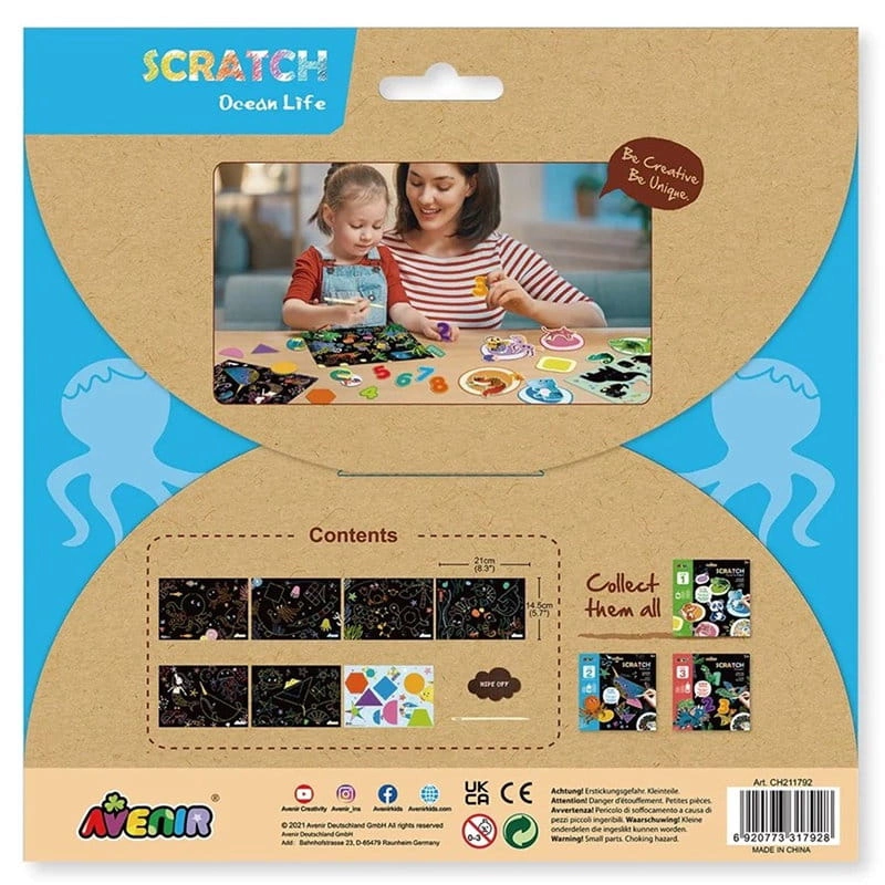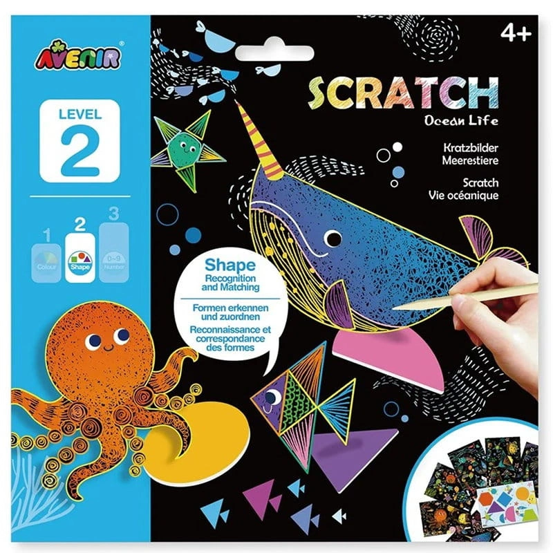 - Avenir Scratch Art Życie w oceanie to zestaw, w którym dzieci zdrapują 7 kart, odkrywając morskie zwierzęta i łącząc je z odpowiednimi kształtami geometrycznymi. Zawiera drewniany patyczek.