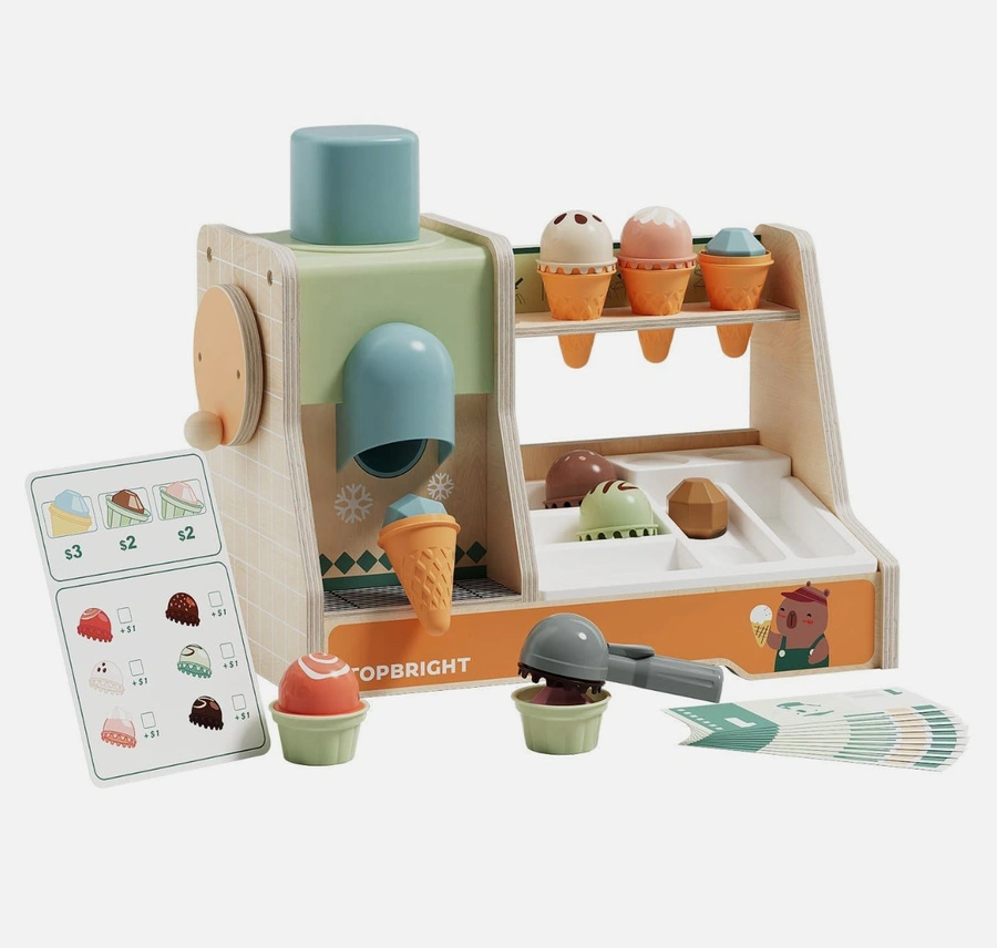 Dzięki kartom zamówień i pieniążkom do zabawy, mali cukiernicy uczą się pierwszych pojęć matematycznych – liczenia, sortowania i prostych działań. Zabawa w lodziarnię rozwija także umiejętności społeczne i komunikacyjne, wspierając naukę poprzez odgrywanie ról.