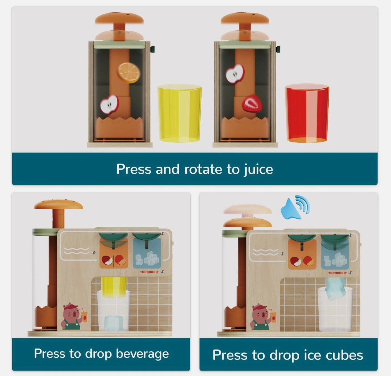 Witamy w barwnym świecie Juice Boutique – wyjątkowej zabawki łączącej mikser do smoothie i automat do soków. Dzieci mogą mieszać drewniane owoce, wrzucać kolorowe kostki lodu i bloki soku wykonane z wysokiej jakości plastiku, a całość urozmaicają realistyczne efekty dźwiękowe.