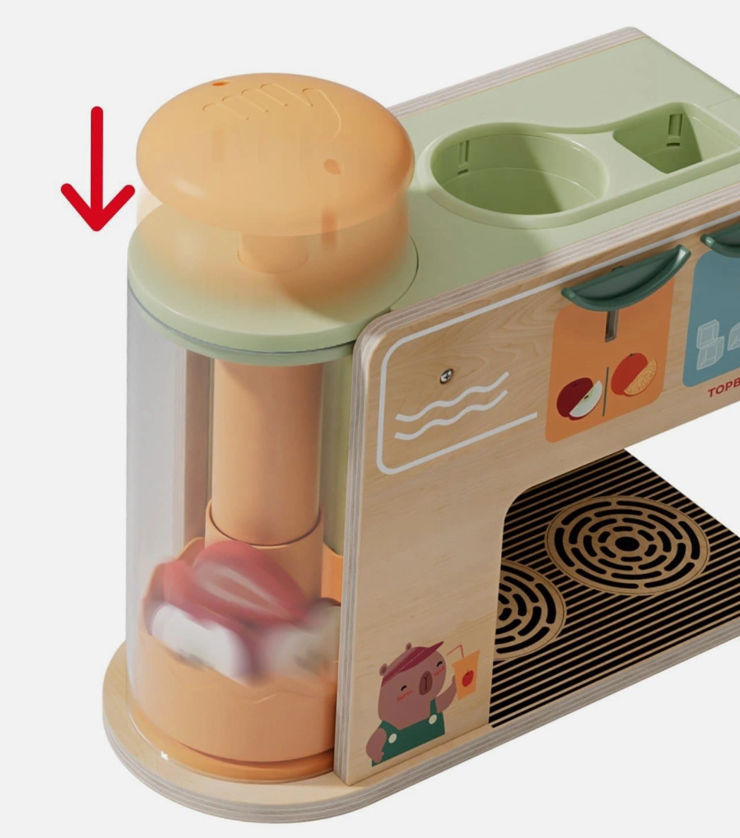 Mechaniczny mikser z obracającą się spiralą pozwala dzieciom „zmiksować” owoce w prawdziwie realistyczny sposób.