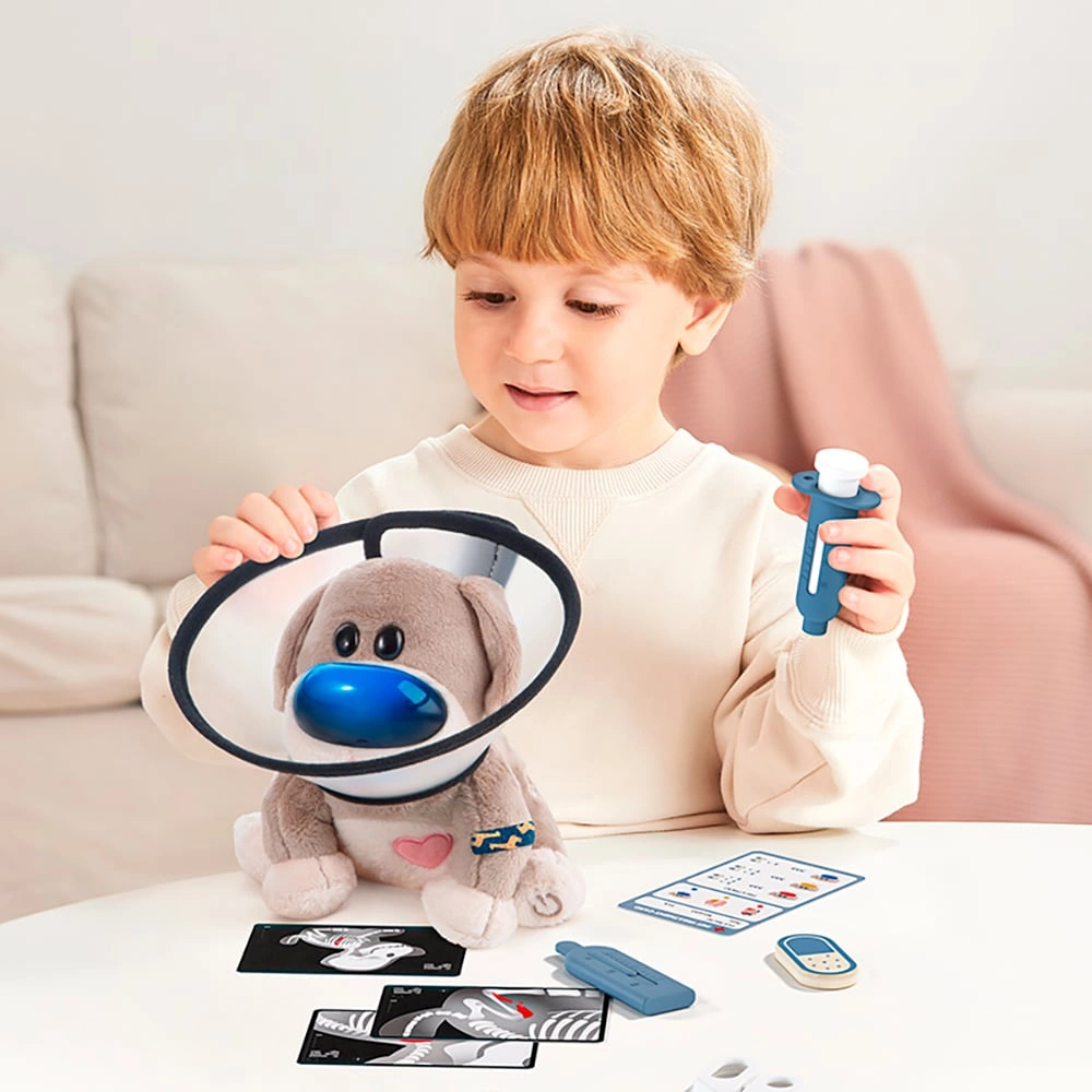 Dzięki kolorowym światłom LED maluchy uczą się rozpoznawać objawy – np. niebieski nosek oznacza przeziębienie, a kolor czerwony może sygnalizować inne dolegliwości. Wystarczy „podanie lekarstwa” lub „zastrzyk”, aby piesek znów poczuł się lepiej!
