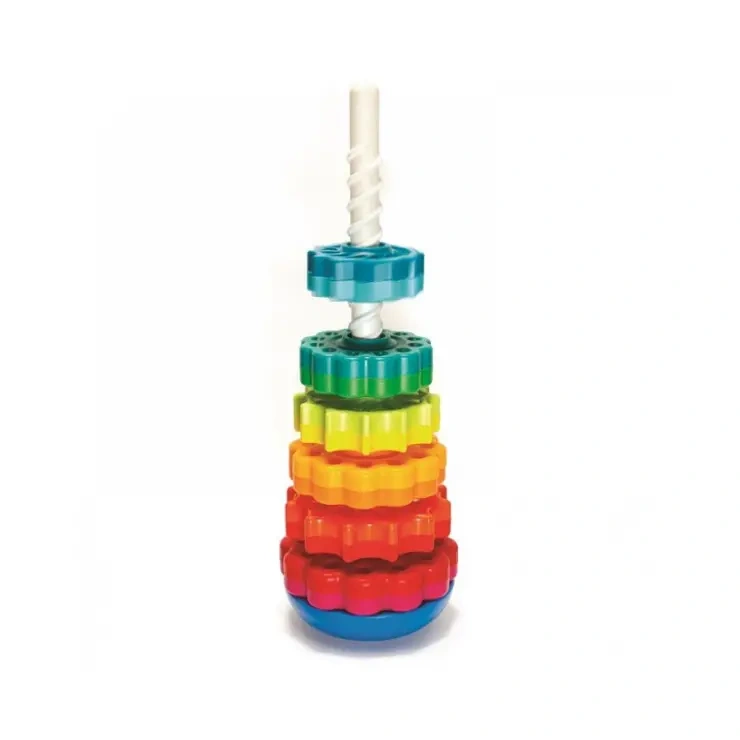 SpinAgain to wyjątkowa, pierwsza tego typu piramida z kręcącymi się elementami, która wciąga dzieci w wir zabawy. Krążki w kształcie gwiazd, dwukolorowe i dynamiczne, nakłada się na spiralny słupek – każdy z nich wiruje i opada, tworząc kolorowy spektakl.