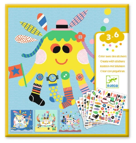 Zestaw artystyczny z naklejkami. Wypełniony przepiękną paletą barw i motywami morskich stworków. W zestawie można znaleźć 16 kart z zarysem danej postaci oraz 6 arkuszy z naklejkami, na których są różne elementy do ozdobienia. Dzięki prostej instrukcji dołączonej do zestawu zabawa jest jeszcze przyjemniejsza. Zestaw wspiera rozwój zmysłu wzroku, dotyku oraz ćwiczy precyzję i poczucie estetyki.