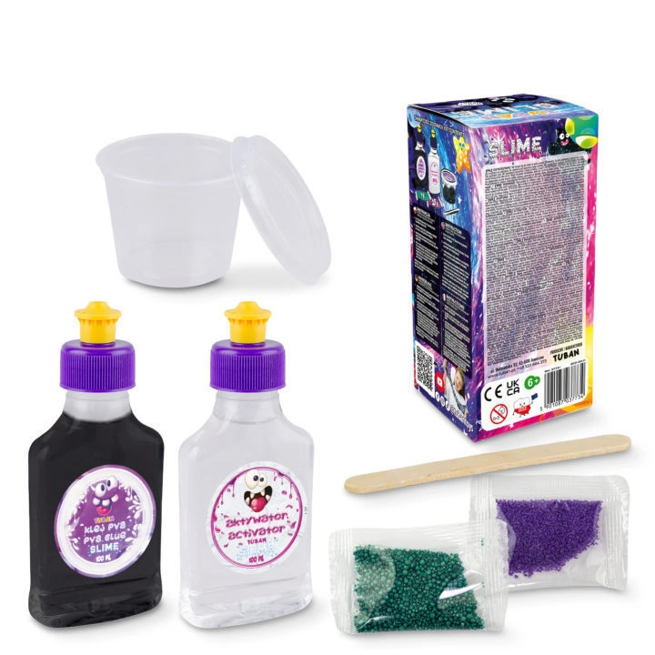 - Magiczny SLIME – zestaw do samodzielnego tworzenia. Stwórz własnego glutka inspirowanego nocnym niebem, pełnego błyszczących, neonowych drobinek!