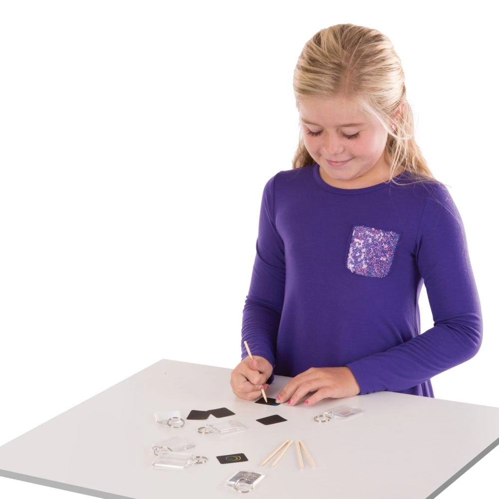 Wystarczy zdrapać czarną warstwę z kolorowej karteczki za pomocą specjalnego drewnianego rysika, aby odsłonić barwny wzór. Gotowy rysunek można umieścić w przezroczystym breloczku i cieszyć się własnoręcznie wykonaną ozdobą.