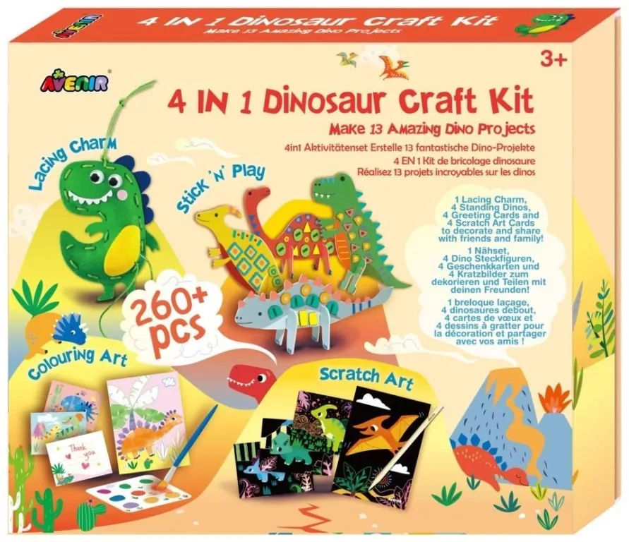 - Zestaw 4w1 Dinozaury: breloczek, kartki, wydrapywanki, figurki 3D. Rozwija wyobraźnię, motorykę i zdolności twórcze. Idealna zabawa dla małych artystów z dinozaurowym motywem!