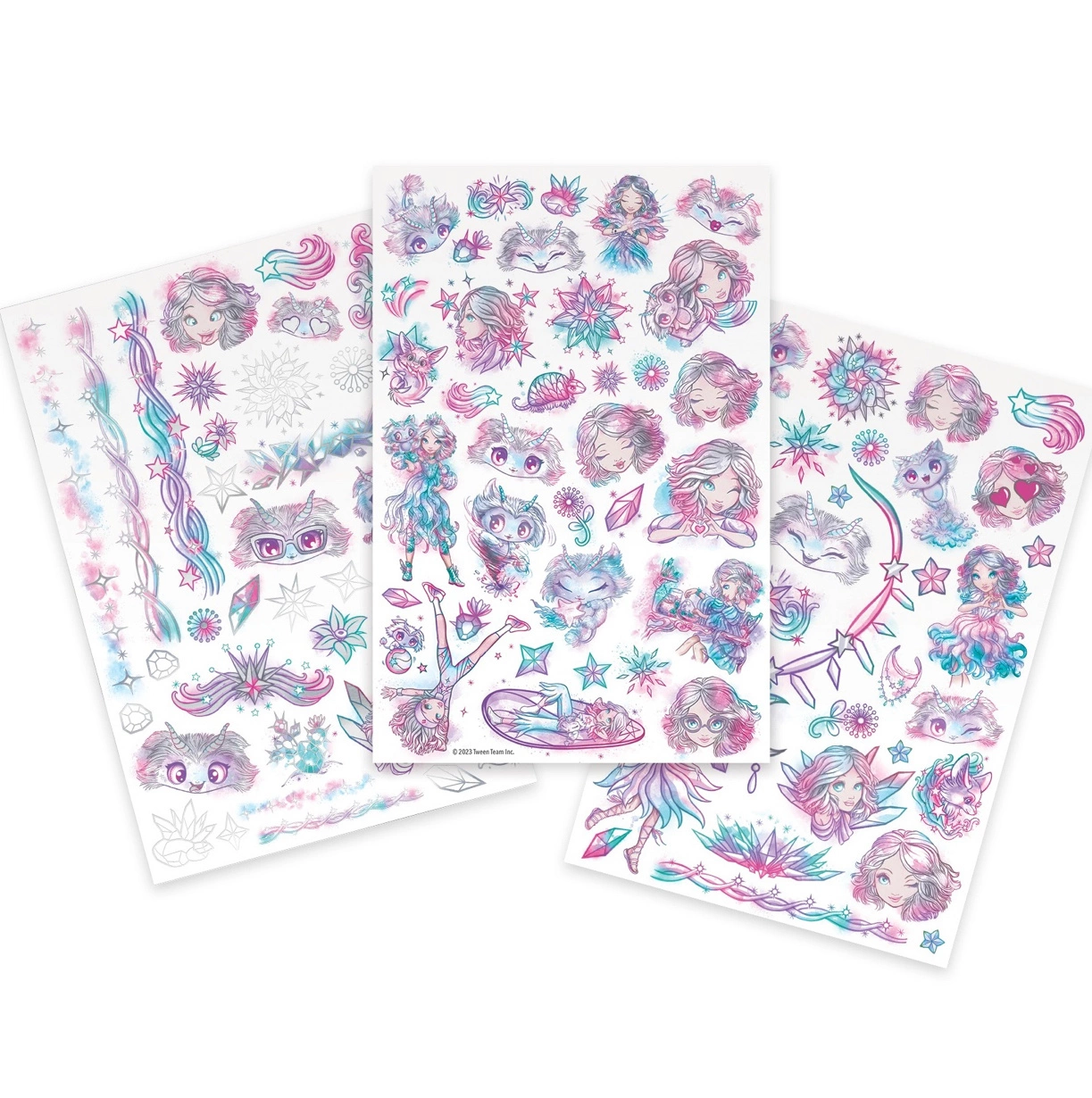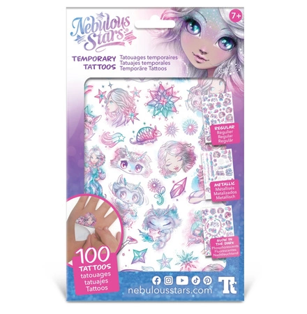 Zestaw Nebulous Stars to propozycja dla dzieci, które lubią wyrażać siebie poprzez sztukę i styl. W opakowaniu znajduje się bogaty wybór tatuaży tymczasowych, które można nanosić na skórę w bezpieczny, łatwy i zmywalny sposób. Kolekcja łączy w sobie trzy wyjątkowe efekty wizualne: brokatowy połysk, metaliczne wykończenie oraz efekt świecenia w ciemności.