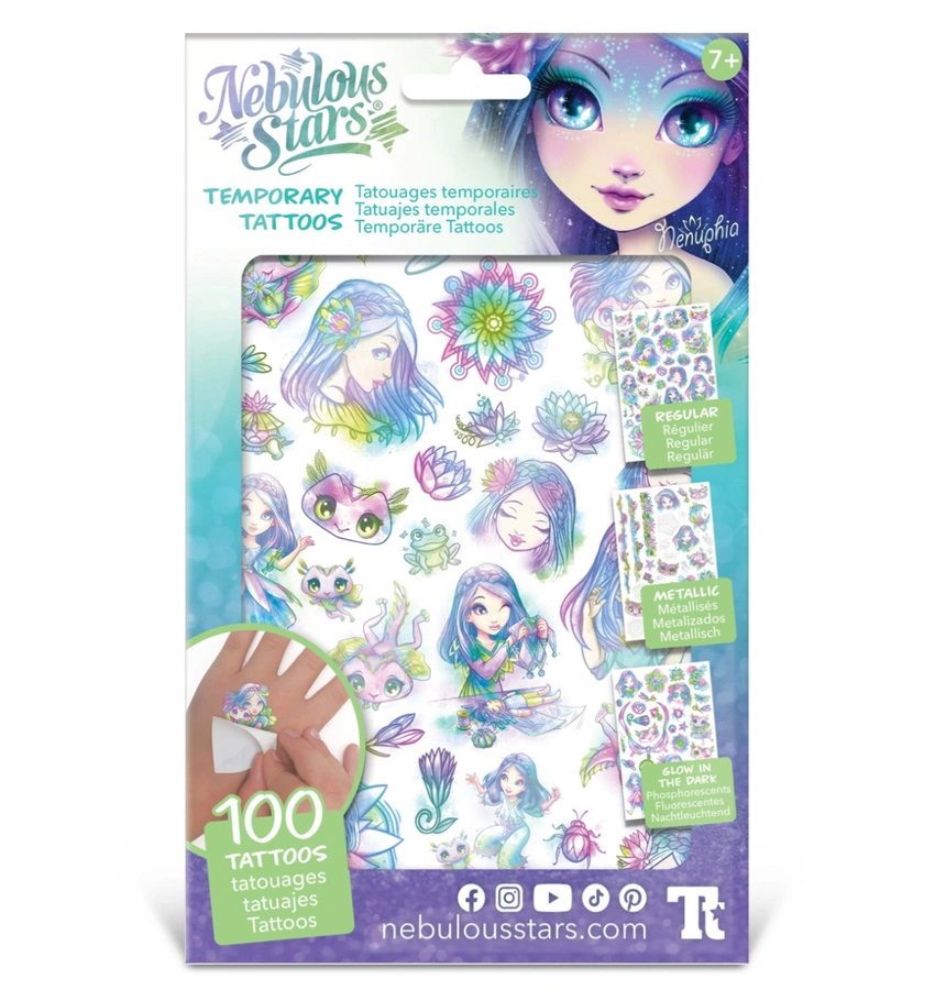 Zestaw do tworzenia tymczasowych tatuaży Nebulous Stars w wersji Nenuphia to idealna propozycja dla dzieci, które chcą ozdabiać swoją skórę w wyjątkowy sposób. Produkt zawiera trzy arkusze z tatuażami w różnych stylach: brokatowym, metalicznym oraz świecącym w ciemności, co pozwala na kreatywną zabawę i różnorodne efekty wizualne.
