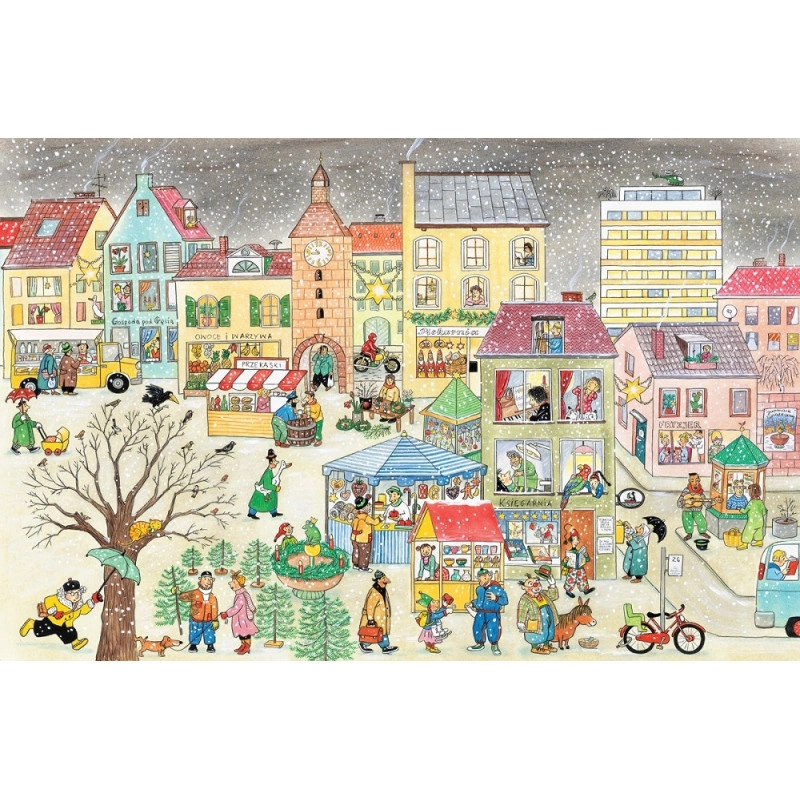 Nadeszła zima. Wszyscy szykują się do świąt Bożego Narodzenia: ubierają choinki, kupują prezenty, odwiedzają świąteczny jarmark. Z nieba sypie puszysty śnieg, a dzieci lepią bałwany, zjeżdżają na sankach i toczą bitwy na śnieżki.