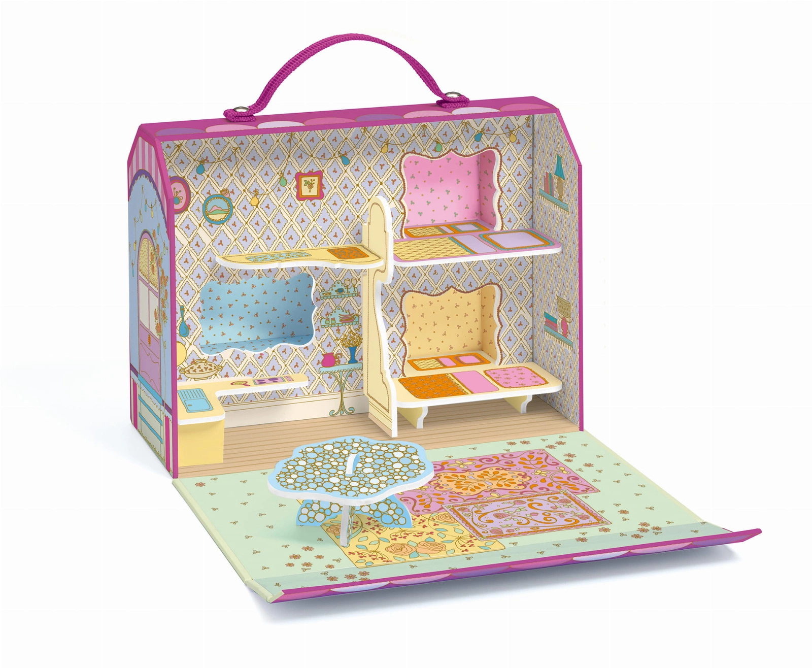 Ten ładny ilustrowany domek w kształcie przyczepy kempingowej jest bardzo łatwy do przenoszenia dzięki uchwytowi, a otwiera się jak walizka. W domu znajdują się kuchnia, pokoje i wnęki, w których można ustawić figurki oraz stół.