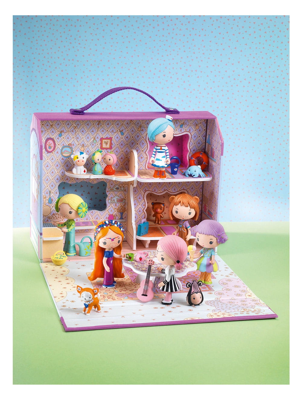 - Domek w formie walizki, stworzony z myślą o figurkach Tinyly. Dzięki uchwytowi produkt jest bardzo łatwy w przenoszeniu. W zestawie znajdują się dwie figurki.