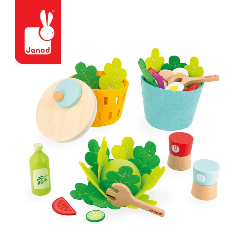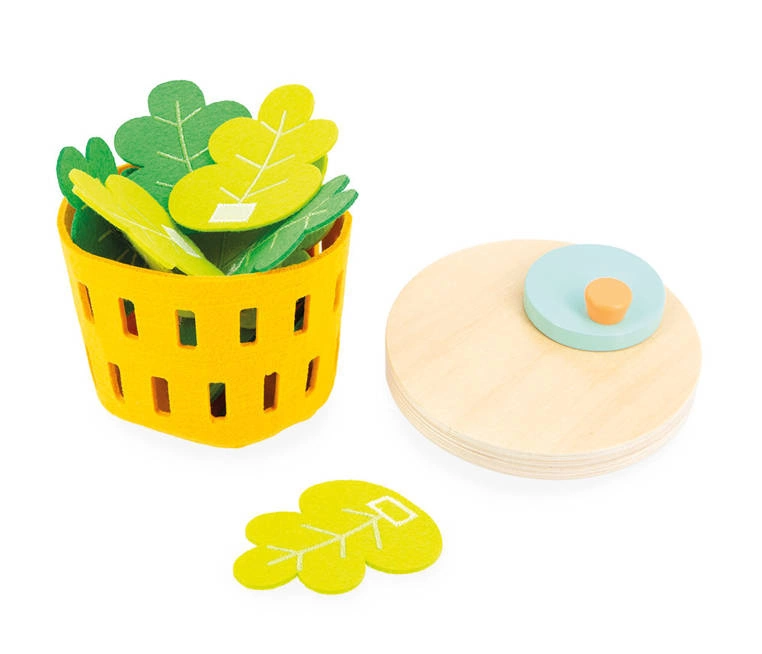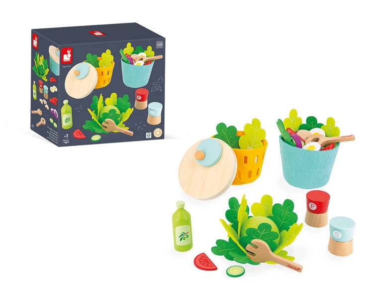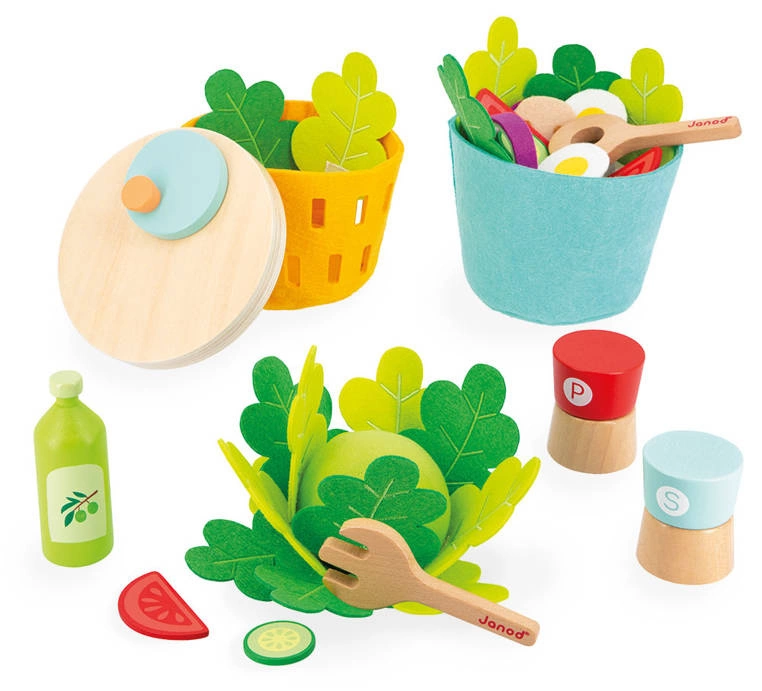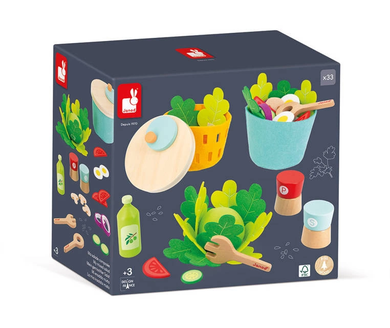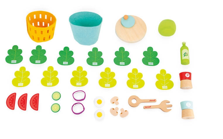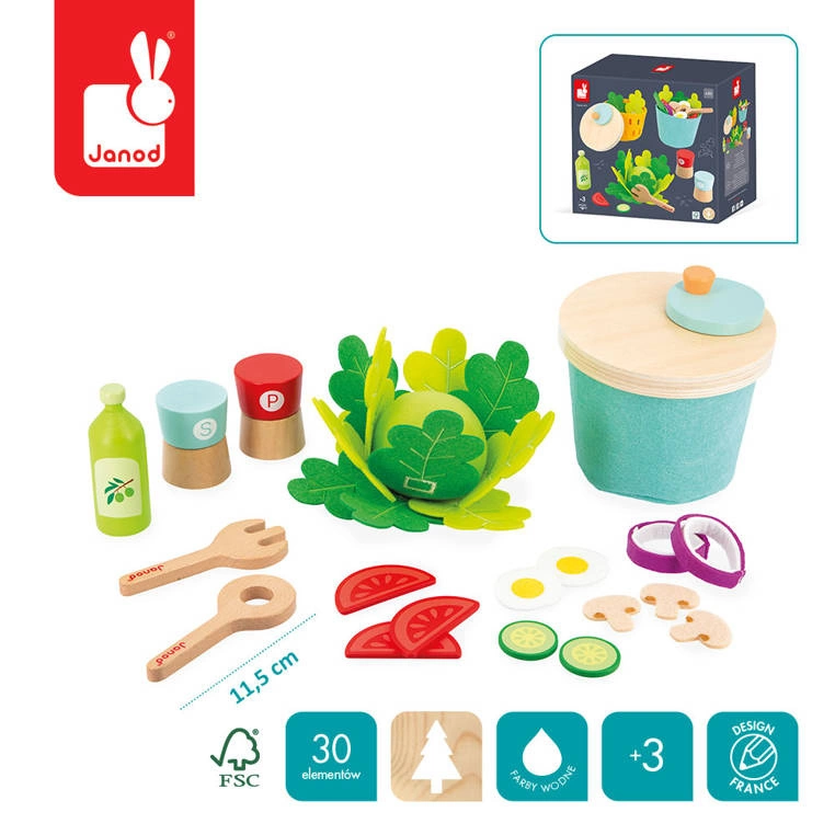 Zestaw Miks sałat francuskiej marki JANOD sprawi mnóstwo radości każdemu dziecku. Pozwoli mu bezpiecznie uczestniczyć razem z rodzicem w codziennych kuchennych czynnościach, poznawać kulinarne tradycje i rozwijać pasję gotowania. W skład 30-elementowego zestawu wchodzą: filcowa miska i filcowa suszarka z drewnianą pokrywką z pokrętłem, główka sałaty z 12 listkami, mocowanymi na rzepy, 3 plasterki pomidora, 2 plasterki ogórka, 2 plasterki cebuli, 2 jajka sadzone i 3 grzybki – wszystko wykonane z filcu, a także komplet sztućców do sałatek, drewniane pieprzniczka i solniczka z młynkami (wydają dźwięki) oraz butelka oliwy z oliwek. Zestaw stanowi świetne uzupełnienie każdej dziecięcej kuchni.