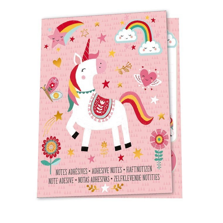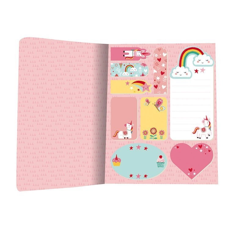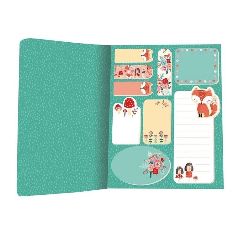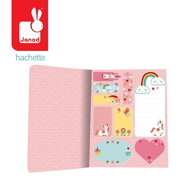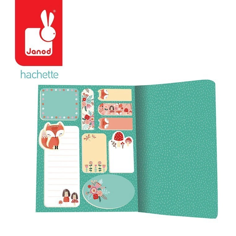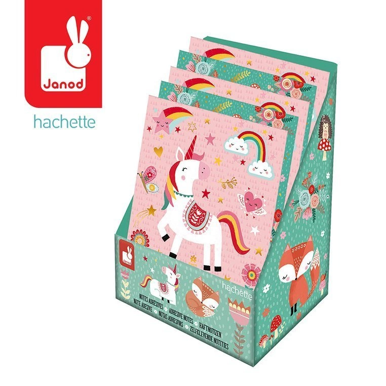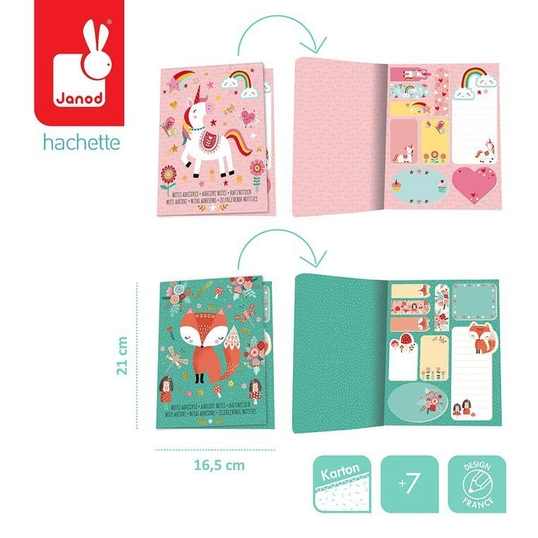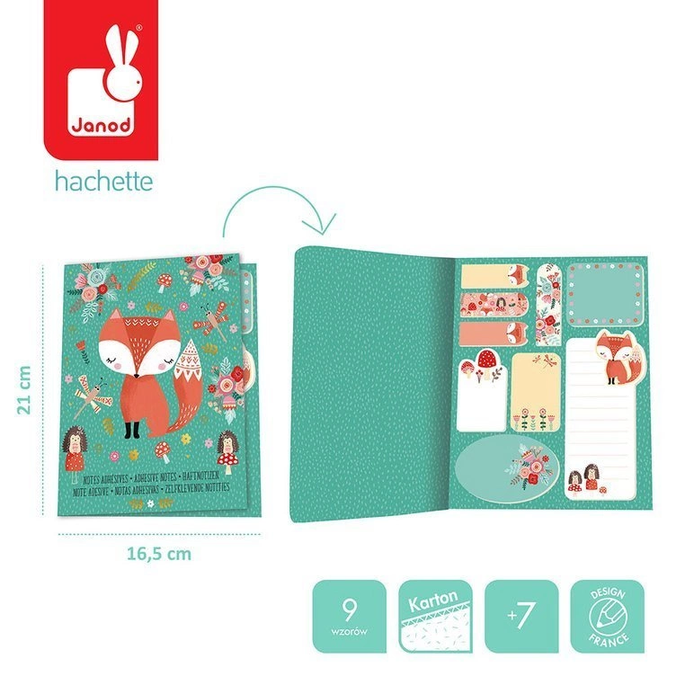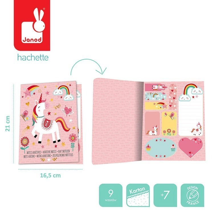 Notes z samoprzylepnymi karteczkami z serii akcesoriów papierniczych francuskiej marki JANOD składa się z grubszej okładki z motywem jednorożca na różowym tle lub lisa na tle turkusowym (w zależności od zestawu). W notesie znajduje się 9 rodzajów samoprzylepnych kartek różnej wielkości i w różnym kształcie w modnym stylu bullet journal, które ułatwiają m.in. orientację w zapiskach oraz umożliwiają wyróżnianie lub ozdabianie notatek. To wspaniały sposób na spędzanie wolnego czasu i wstęp do nauki planowania.