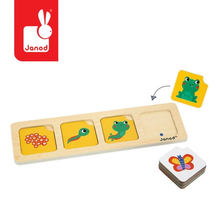 Karty sekwencji Ogród francuskiej marki JANOD to idealna zabawka edukacyjna dla dzieci od 3. roku życia. Pomoże ona maluchom zrozumieć zależności przyczynowo-skutkowe różnych zdarzeń i procesów, zachodzących w przyrodzie. Zestaw składa się z drewnianej podstawki i dziesięciu 4-elementowych sekwencji kart, tematycznie związanych z ogrodem – są na nich zilustrowane m.in.: przeobrażenie się gąsienicy z motyla, wykluwanie się ptaszka z jajka, rozwój żaby ze skrzeku czy kwiatka z nasionka. Zadaniem dzieci jest ułożenie ich na podstawce w odpowiedniej kolejności (ułatwiają to kropki w odpowiednich kolorach – te na kartach odpowiadają tym na podstawce). Zabawka rozwija umiejętność obserwacji i logicznego myślenia oraz wiedzę z zakresu przyrody.