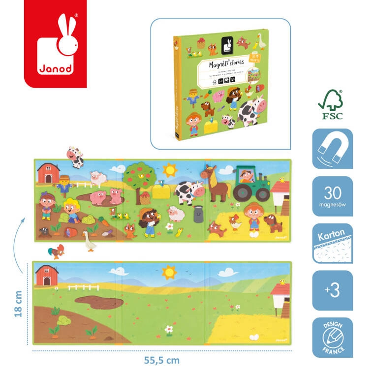 - Odkryj fascynujący świat farmy z zestawem Magneti’stories Janod! 30 magnesów do kreowania własnych opowieści na potrójnej planszy. Dla dzieci: +3.