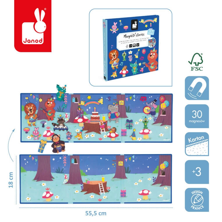 - Odkryj fascynujący świat leśnych zwierząt z zestawem Magneti’stories Janod! 30 magnesów do kreowania własnych opowieści na potrójnej planszy.