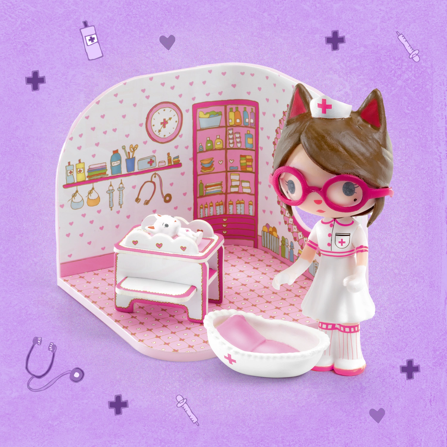 Mała lecznica dla zwierząt Snowy'ego i jej nieodłącznej towarzyszki Loulou. W zestawie mały koszyczek na zwierzaka i stół weterynaryjny.
