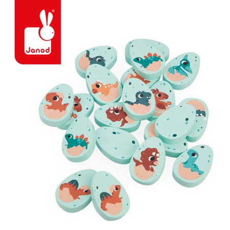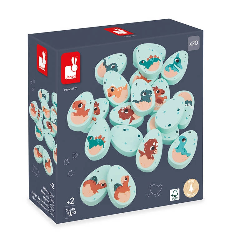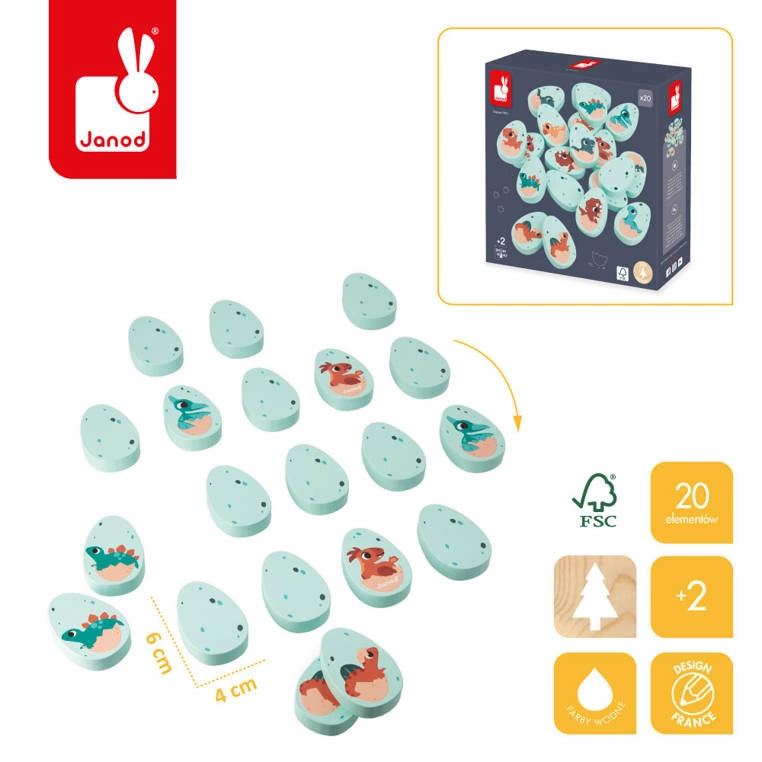 Drewniana gra memory z kolekcji Dinozaury francuskiej marki JANOD to wspaniała zabawa dla jednego lub kilkorga dzieci. Składa się 20 (10 par) solidnych drewnianych dinozaurowych jaj w pięknym jasnoturkusowym kolorze, na których odwrocie znajdują się przyjazne wykluwające się prehistoryczne stworzenia. Dinozaury należy skompletować – parę tworzą dwa identyczne maluchy. Gracz, który zgromadzi więcej par – wygrywa. Gra typu memory trenuje pamięć, koncentrację, spostrzegawczość i refleks. Materiał, z którego wykonane są jej elementy, posiada certyfikat FSC, co oznacza że pochodzi z lasów zarządzanych w sposób zrównoważony. Zabawka zostałą zaprojektowana we Francji. Zapakowana jest w estetyczne kartonowe pudełko. Idealnie nadaje się na prezent.