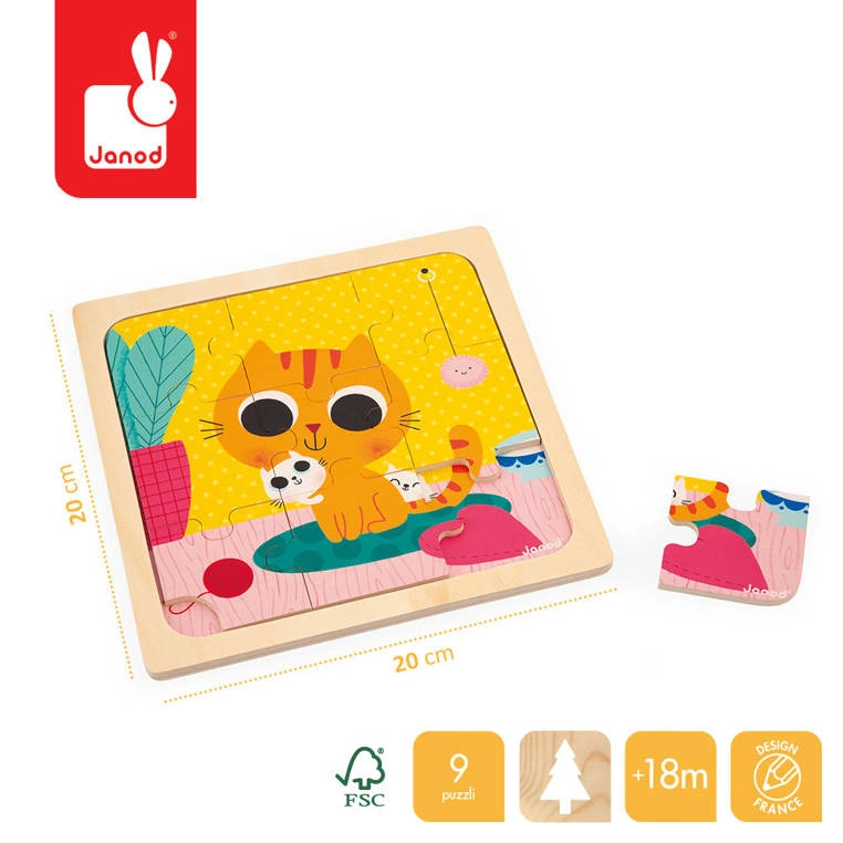 - Drewniane puzzle "Kotek Orzeszek" od Janod to idealna pierwsza układanka dla malucha, rozwijająca małą motorykę, pamięć i koordynację ręka-oko.