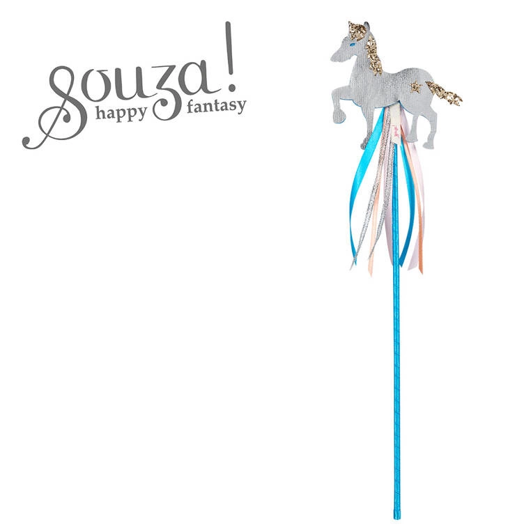 Różdżka z konikiem holenderskiej marki Souza! Obciągnięta jest niebieską satynową wstążką. U góry zdobi ją biały konik ze złotą grzywą, ogonem i gwiazdką oraz kilka wąskich tasiemek w kolorach: niebieskim, białym, srebrnym i brzoskwiniowym. Ma 35 cm długości, jest poręczna i lekka. Stanowi idealny dodatek do kostiumu wróżki lub księżniczki. Sprawdzi się także jako prezent.