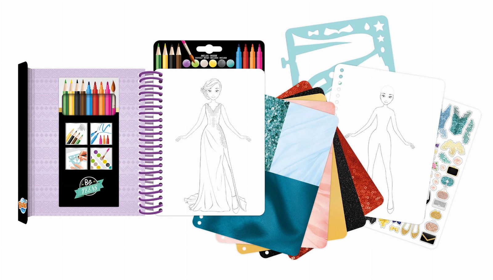 Wykorzystaj samoprzylepne tkaniny, aby ożywić swoje projekty. Narysuj ubrania za pomocą szablonów, a następnie dodaj samoprzylepne akcesoria. Szkicownik w formie zeszytu ze spiralą i magnetycznym zapięciem, zawierający wszystkie niezbędne akcesoria zmieści się w torebce czy plecaku i będzie Ci zawsze towarzyszył - na przerwie w szkole czy w podróży.