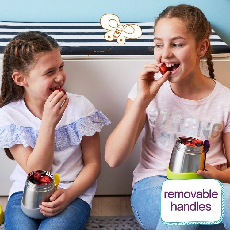 termos na jedzenie; izolację zapewnia system podwójnej ścianki zapewniający utrzymanie temperatury zimnego posiłku do 7 h a gorącego do 5 h*; szeroki otwór umożliwia wygodne nakładanie posiłku, jego spożywanie a także wymycie wnętrza termosu; silikonowa nakładka na spód zabezpiecza pojemnik i sprawia, że nie suwa się po blacie; przykrycie w formie szerokiej nakrętki ze zintegrowanym uchwytem jest łatwe w obsłudze nawet przez dzieci; silikonowe uchwyty ułatwiają spożywanie posiłku w różnych warunkach; do termosu dołączono silikonowy bezpieczny widelczyk, który mocowany jest do silikonowej podstawy (kompaktowy zestaw, który łatwo zabrać ze sobą tam, gdzie będzie potrzebny); można zabrać go do szkoły, przedszkola, na spacer, w podróż i na wycieczkę czy piknik; łatwo go wyczyścić, szeroki otwór pozwala swobodnie dotrzeć do wnętrza. Parametry techniczne: