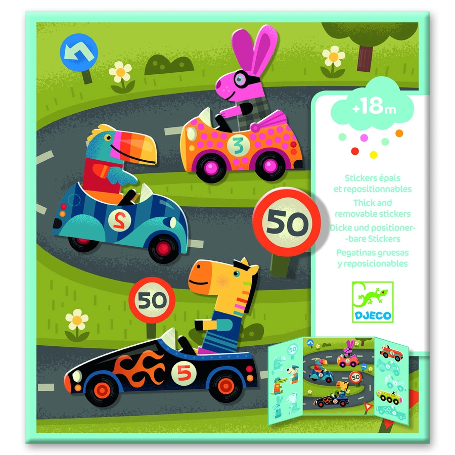 - Zestaw jest w kształcie książeczki z grafiką toru wyścigowego i naklejkami w komplecie. Dzieci mogą ozdabiać ilustracje i komponować sceny wyścigów samochodowych.